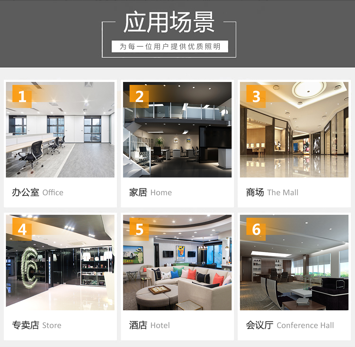 LED筒燈是一種嵌入到天花板內(nèi)光線下射式的照明燈具,光束角屬于廣角度,光線較分散均勻。LED筒燈不占據(jù)室內(nèi)空間,在室內(nèi)安裝LED筒燈,因?yàn)闊艟叩碾[密性,不會(huì)使用產(chǎn)生壓迫的感覺,相反地會(huì)產(chǎn)生溫馨的效果。 旅館、酒店、賓館的照明運(yùn)用LED筒燈等產(chǎn)品,給顧客帶來一種不一樣的感受,除了節(jié)約能源之外,還能盡顯豪華和溫馨。 起居室和家庭影院照明,利用LED筒燈的燈光色彩來烘托一種溫暖、和諧的情調(diào),體現(xiàn)舒適、休閑的氛圍。 博物館、美術(shù)陳列館等場所屬于對(duì)照明環(huán)境要求較高的特殊場合,其展示物品的特殊性要求照明光源不含紫外線,沒有熱輻射。LED筒燈是冷光源,光線中不含紫外線,完全可以滿足博物館、美術(shù)陳列館對(duì)照明的特殊要求。 會(huì)議室、多功能廳照明可以依據(jù)會(huì)議內(nèi)容的不同調(diào)整會(huì)議室或多功能廳的照明環(huán)境,嚴(yán)肅或是活潑可以自由設(shè)定,LED筒燈可以滿足不同會(huì)議主題對(duì)光環(huán)境的需求。 專賣店、商場等室內(nèi)商業(yè)氣氛照明,LED筒燈很適合烘托專賣店和商場的氣氛,LED光源能營造出其他傳統(tǒng)照明電光源所無法比擬的高品質(zhì)光環(huán)境。 其它室內(nèi)照明場所。